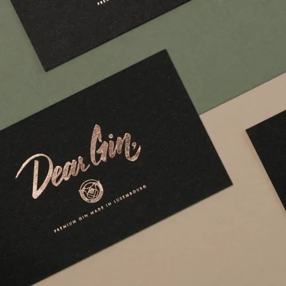 Folienprägungen in Roségold/Kupfer metallic! Schwarzen Visitenkarten mit einer Heißfolienprägung auf echten durchgefärbten Kartons. Wählbar in diversen Stärken. Dieses Produkt ist in den Top 3 unserer meistverkauften Visitenkarten. Zurecht, wie wir finden! Produziert wurde auf einem 400g/qm starken schwarzen Blackmagic Feinstkarton, beidseitig veredelt mit der Luxor 355 Roségold/Kupfer metallic Folie. Wem das nicht reicht, den bieten wir auf individueller Anfrage eine noch größere Auswahl an Folienfarben und Druckvarianten. Die Dean Gin Visitenkarten zeigen deutlich, was maximal mögliche ist mit einer feinen…